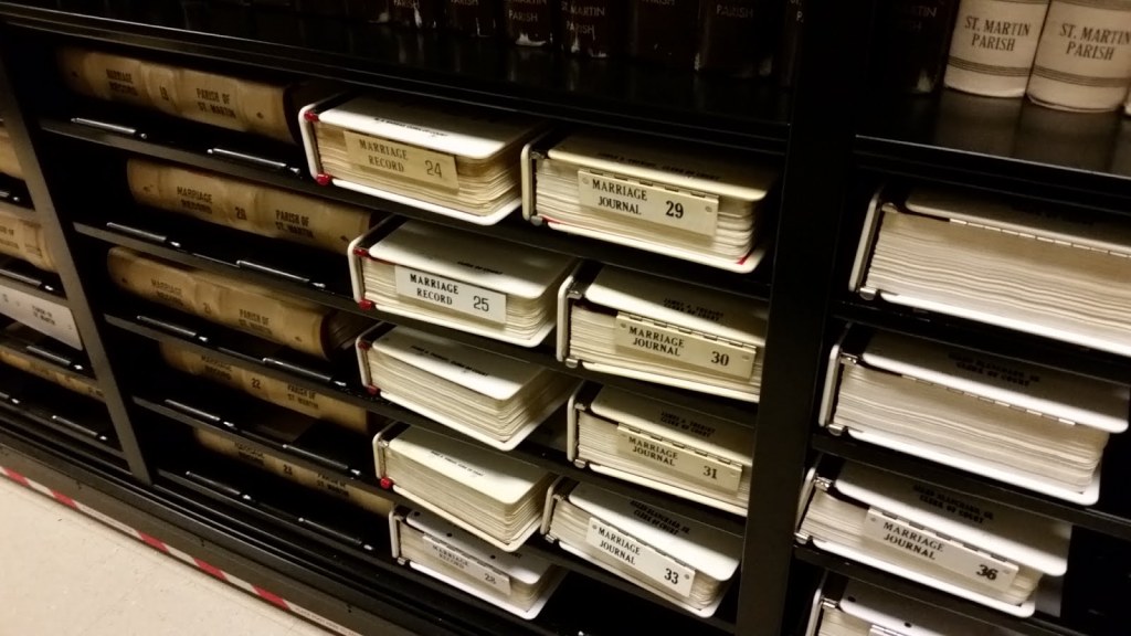 The St. Martin Parish Court Records building is behind the courthouse at 415 South Main in St. Martinville, Louisiana. This is a modern facility – thankfully air-conditioned for this California-born researcher. From my understanding, records access is self-serve compared to the actual recordings. I have no problem being corrected on this point, but I didn’t have to ask permission. On this day, I found a very helpful fellow researcher (Wayne) who knows the place inside and out. He pointed me in the right direction. I was looking for a marriage record and some succession documents. I found the document for the marriage record and then asked the staff to make a copy for me – for a fee. The succession record was a different process, maybe because it was so old. I had the number and date of filing. A clerk pulled it from the back (not public) room. I asked her for copies – again for a fee.