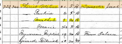 Taking the surname of your previous slaveholder happened in less than half of all instances, but it did take place. In this example, the evidence for this point is convincing. Notice also Adeline lists her occupation as “Domestic ___”. I’m betting that after her emancipation, she just stayed on with the Theriot family – now as an employee. We cannot know if Pauline, Anathole, and Marie were Adeline’s children because the 1870 Census did not ask for relationships.