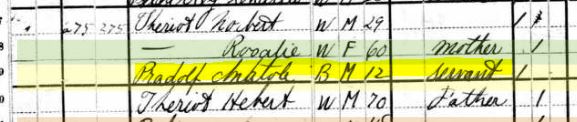 One last observation. Going forward, we find my Hubert Theriot in the 1880 Census. Hubert and his wife, Rosalie, lived with their son Norbert. Also listed is a young man named Anatole Pardolf, age 12, a male black. His role is “servant.” Remember young Anathole Theriot, age three, from the 1870 Census? The surname is different, but everything else lines up.