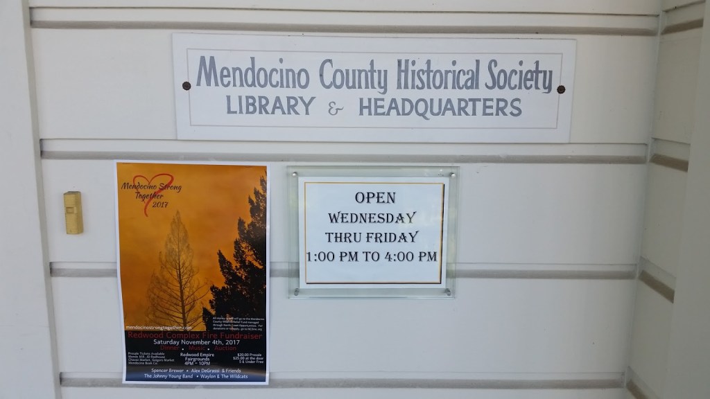 The Mendocino County Historical Society maintains the Held-Poage Research Library at 603 West Perkins Street in Ukiah, California 95444. Their website is http://www.mchs.ws.