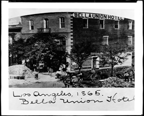 USC Libraries, “View of the Bella Union Hotel in Los Angeles, showing workers around mounded dirt and rubble,” Libraries.usc.edu, accessed March 30, 2022, https://digitallibrary.usc.edu/asset-management/2A3BF1GM9IV?FR_=1&W=1502&H=717, an image from the California Historical Society Collection, 1860-1960.